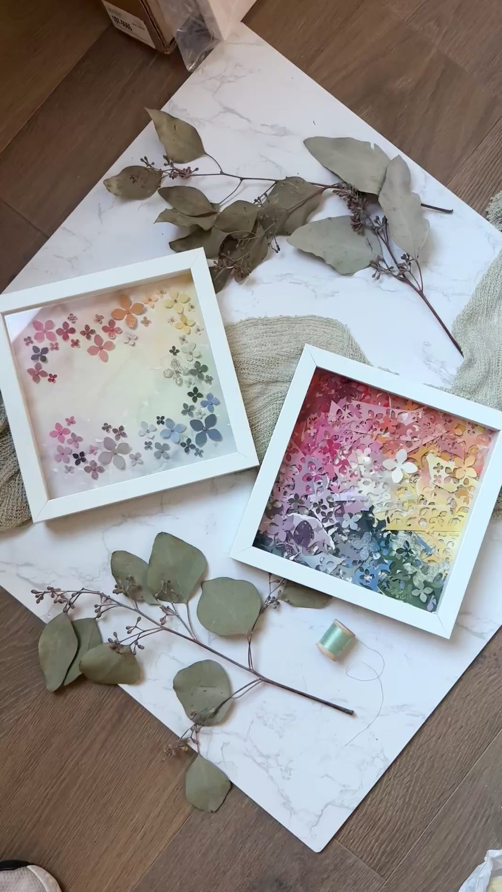 Square 8" x 8” original paper floral art remnants. Using a mix of papers and acrylic paints this showcases the beauty of what was left behind from making the paper floral art. Set in a white wooden frame measuring 9" x 9"