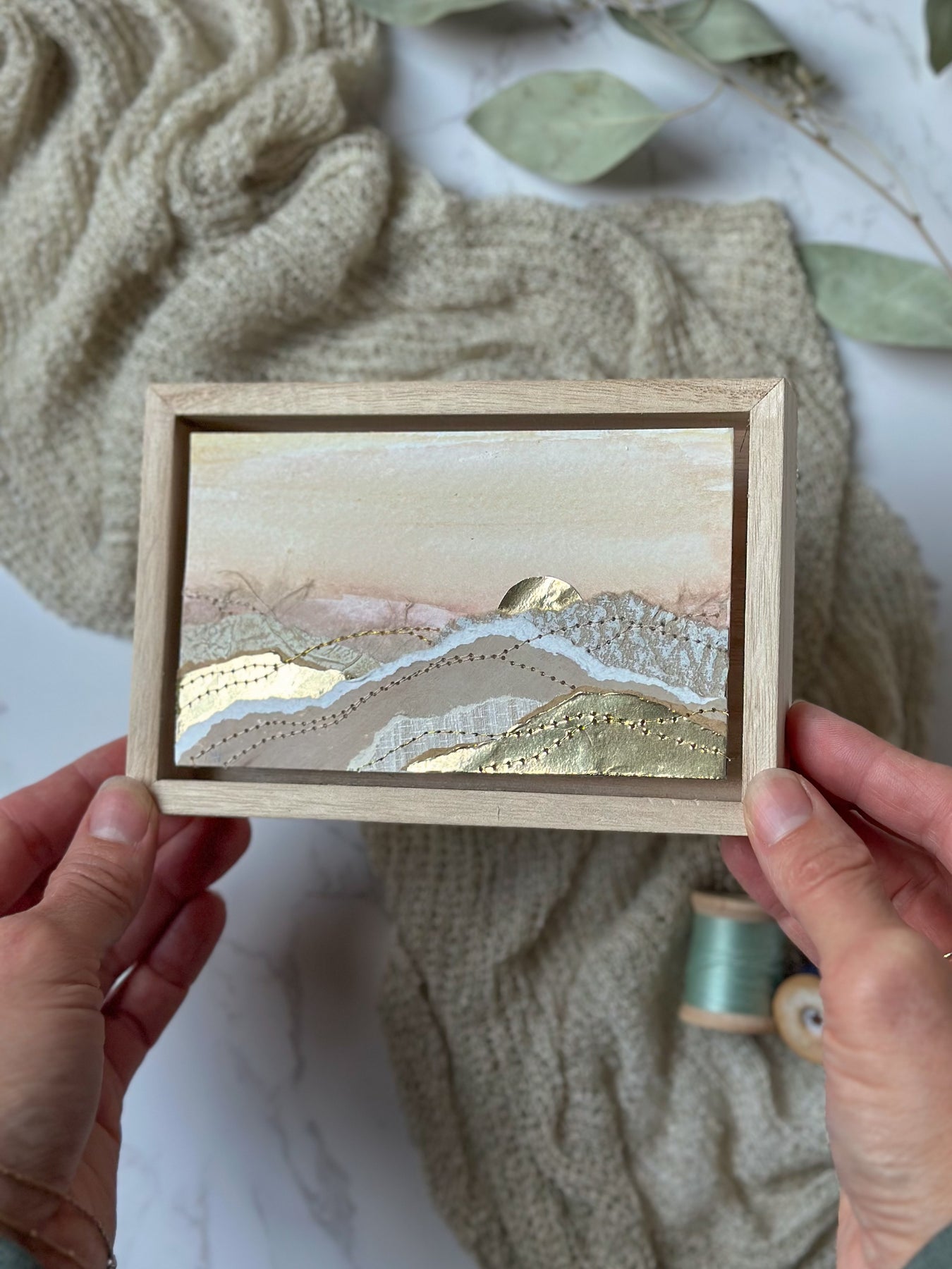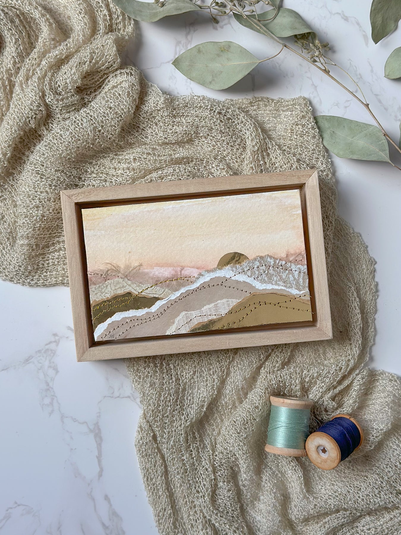 Rectangle 5" x 3.5” original sewn abstract art on mixed media paper. Using hand painted, torn papers and a variety of threads. Set in a natural wooden frame. The frame measures 6" x 4" and is 1" deep. It can be displayed sitting up on a bookshelf or on a wall. Signed and dated by the artist on the back.