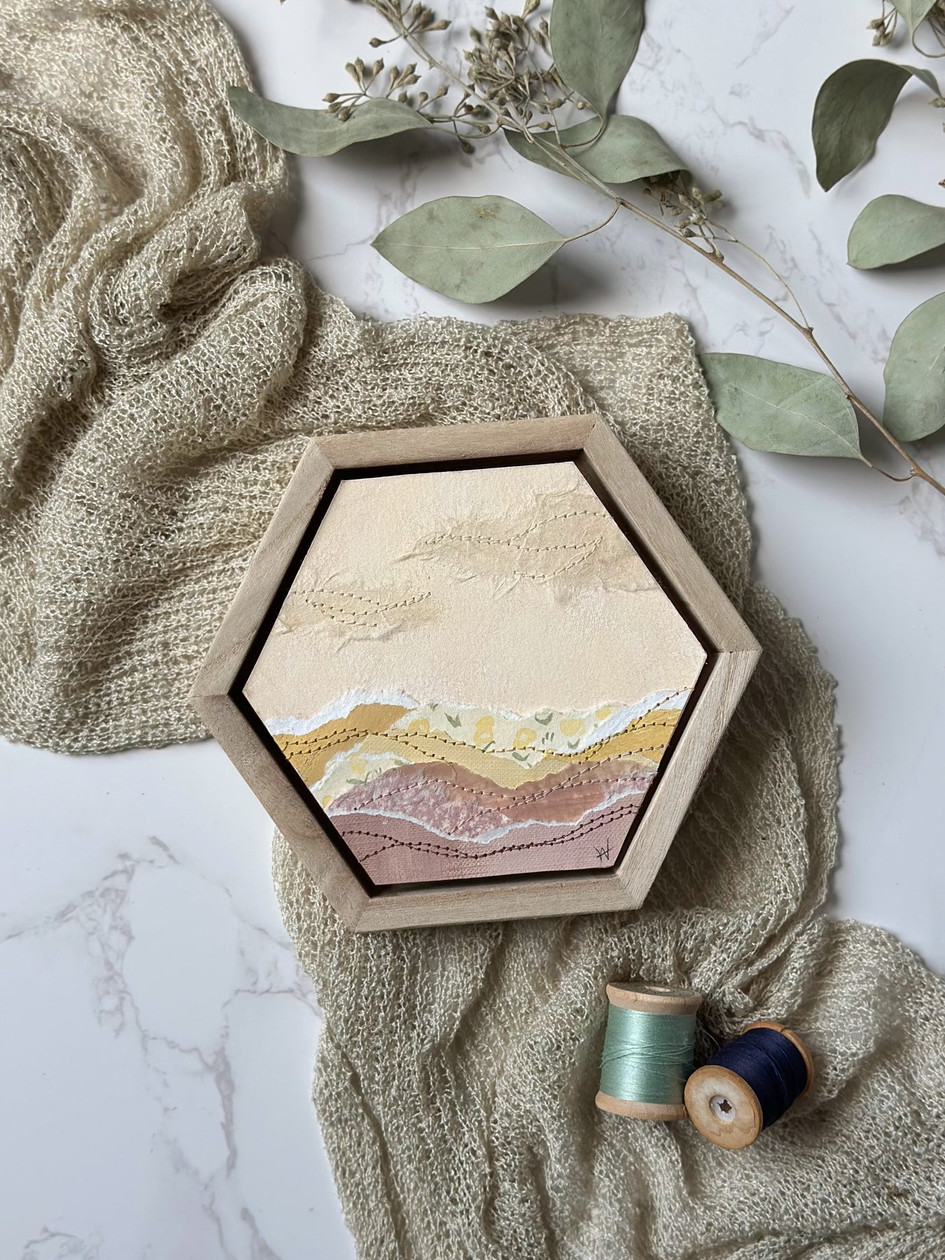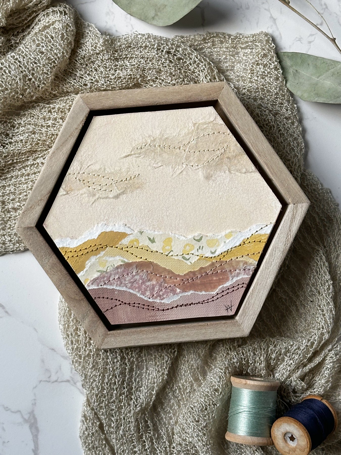 Hexagon 4" x 5” original sewn abstract art on mixed media paper. Using acrylic and watercolor paints, layered painted papers and a variety of threads. Float mounted in a wooden frame. Frame measures 5" x 6" and is 1" deep. It can be displayed sitting up on a shelf or hung on a wall.