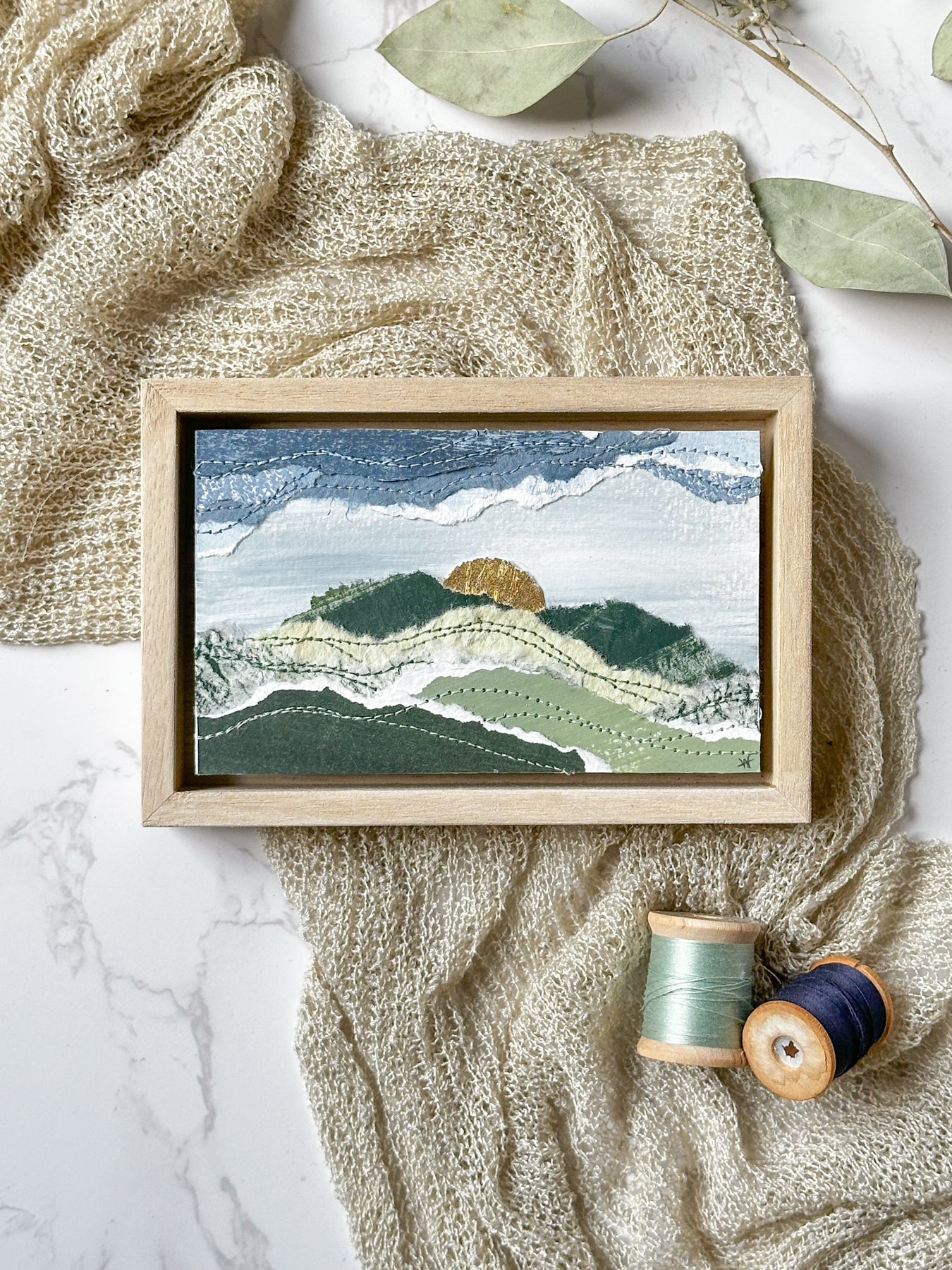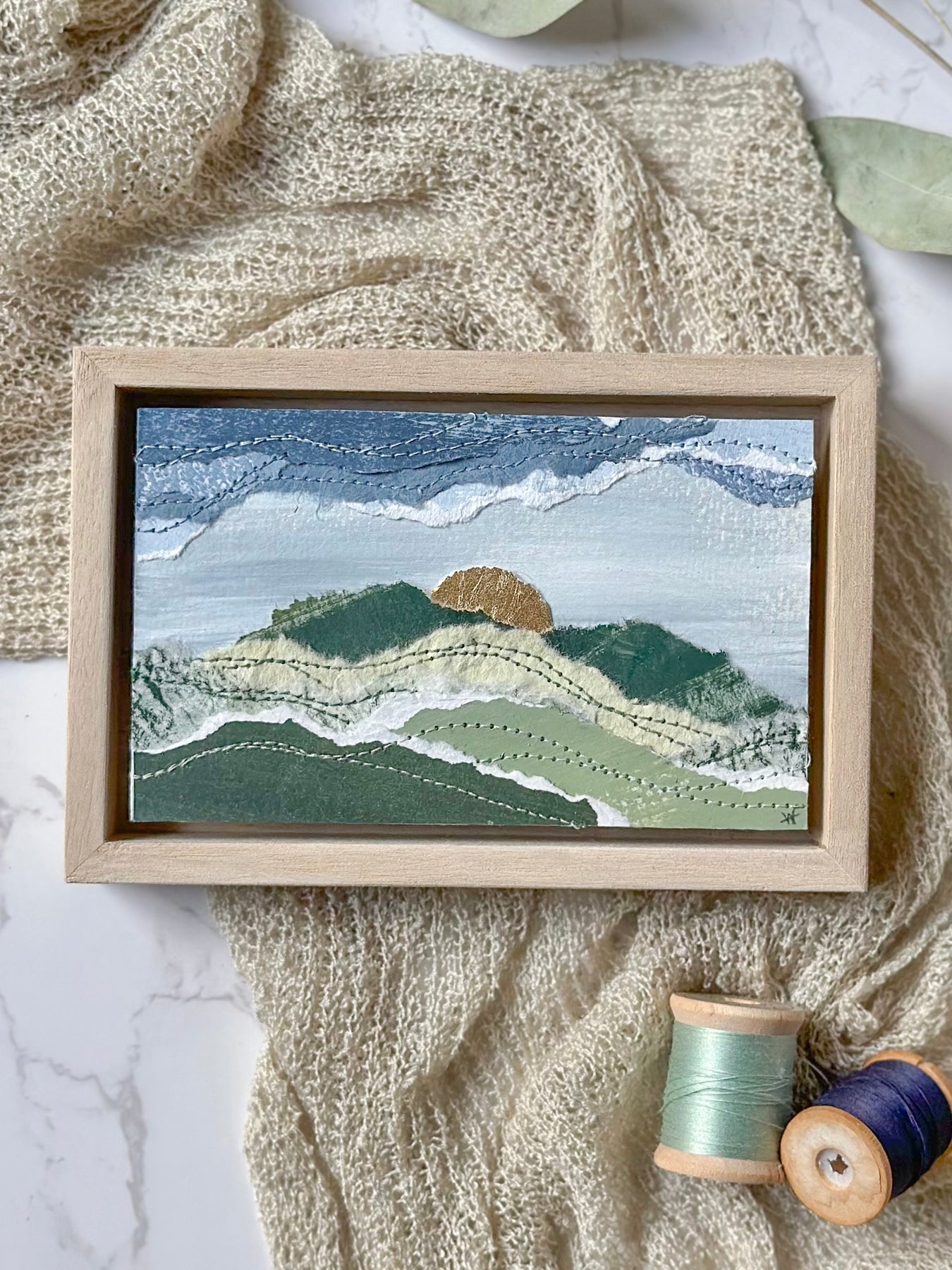 Rectangle 5" x 3.5” original sewn abstract art on mixed media paper. Using hand painted, torn papers and a variety of threads. Set in a natural wooden frame. The frame measures 6" x 4" and is 1" deep. It can be displayed sitting up on a bookshelf or on a wall. Signed and dated by the artist on the back.