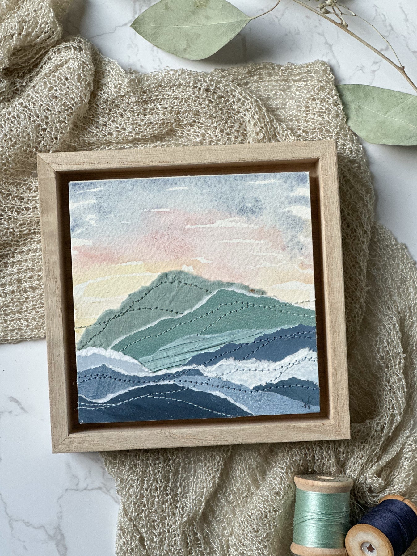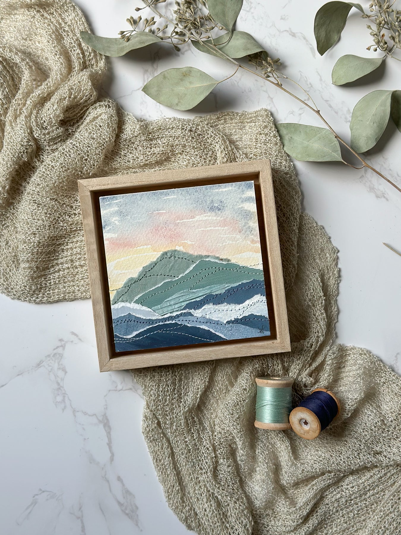 Square 4" x 4” original sewn abstract art on watercolor paper. Using acrylic and watercolor paints, layered painted papers and a variety of threads. Float mounted in a wooden frame. Frame measures 5" x 5" and is 1" deep. It can be displayed sitting up on a shelf or hung on a wall.