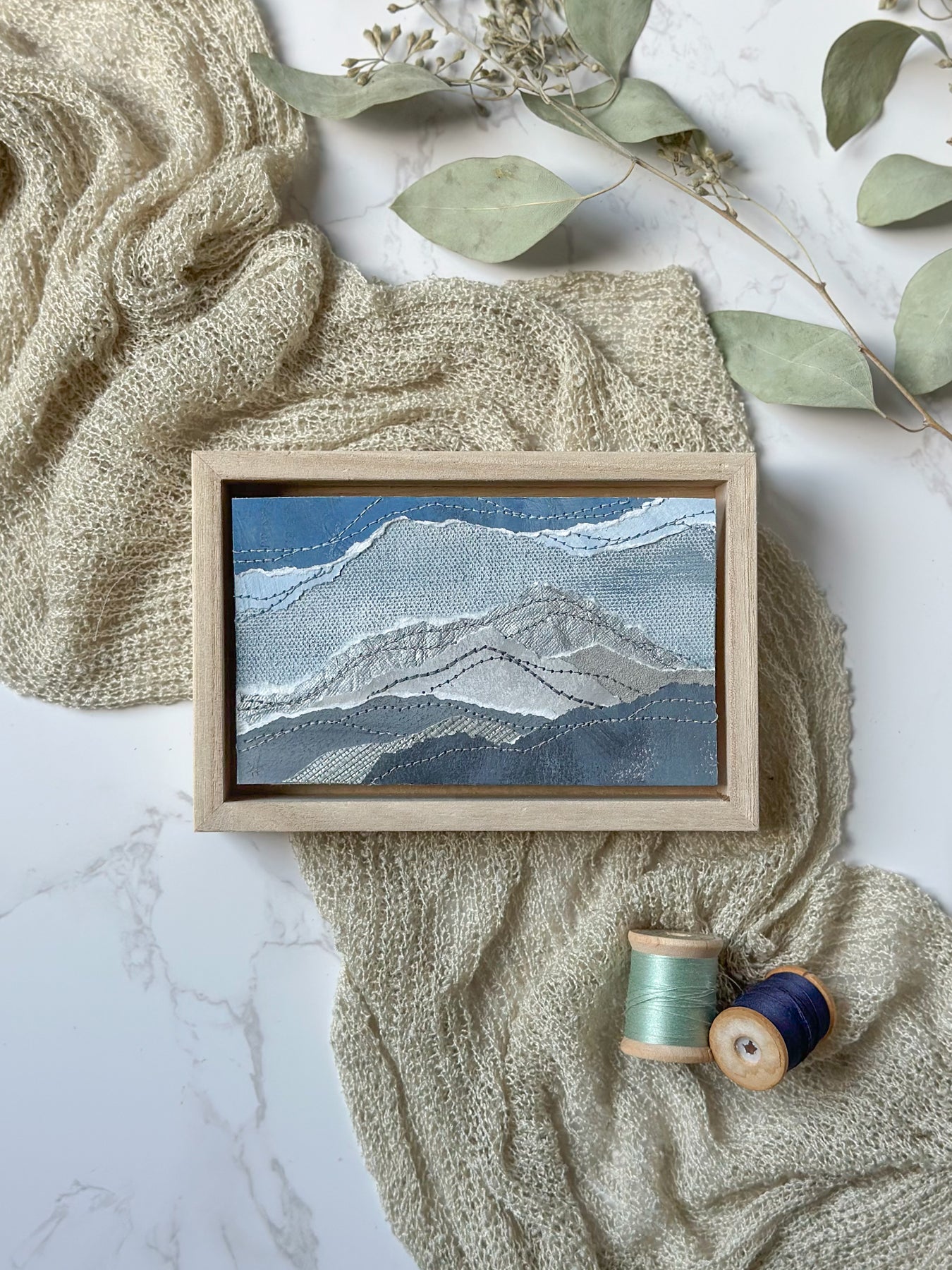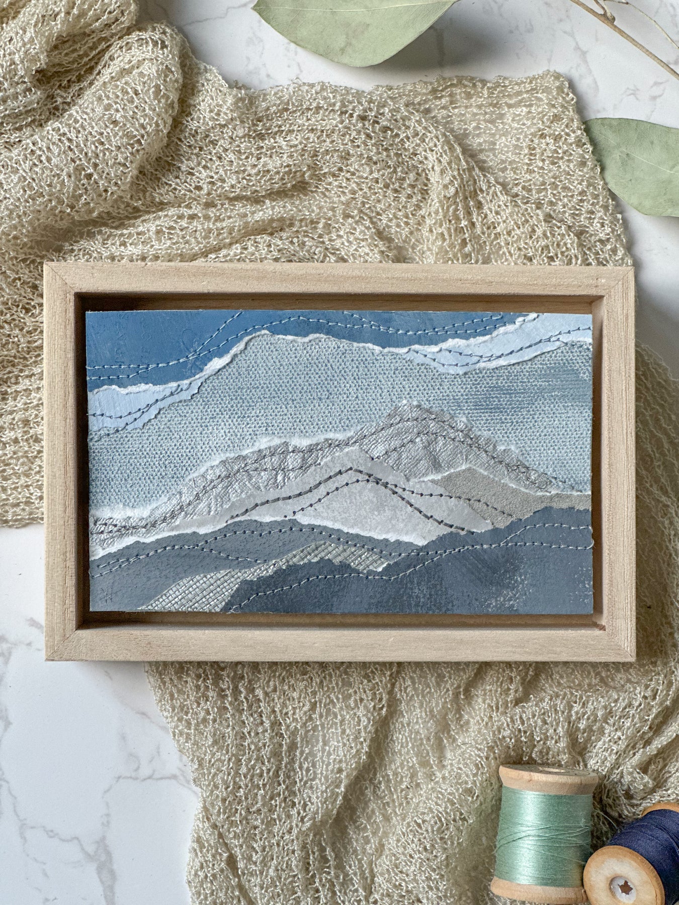 Rectangle 5" x 3.5” original sewn abstract art on unstretched canvas. Using hand painted, torn papers and a variety of threads. Set in a natural wooden frame. The frame measures 6" x 4" and is 1" deep. It can be displayed sitting up on a bookshelf or on a wall. Signed and dated by the artist on the back.