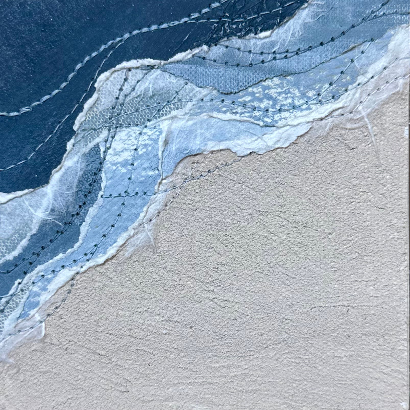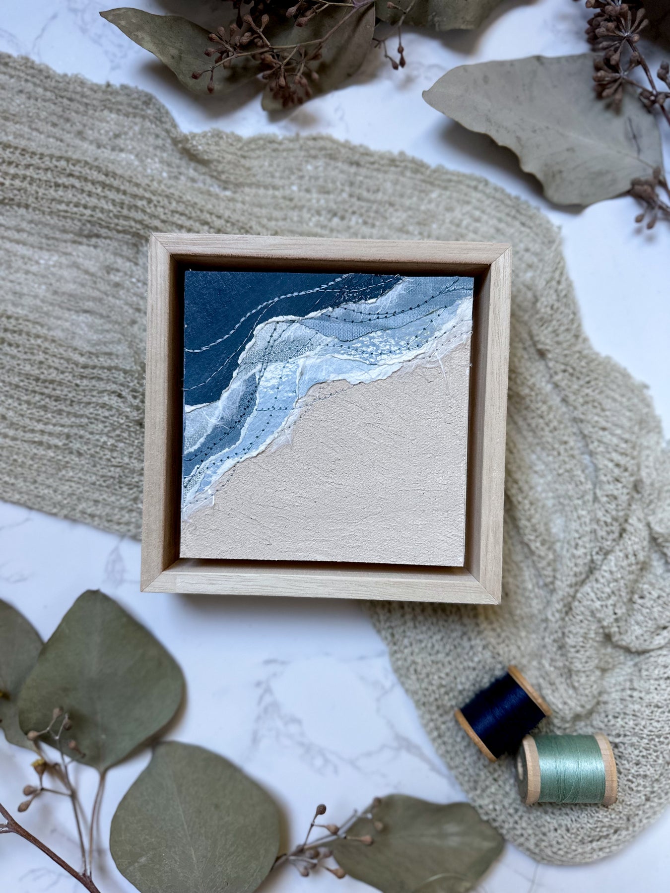 Square 4" x 4” original sewn abstract art on unstretched canvas. Using acrylic paints, layered painted papers and a variety of threads. Float mounted in a wooden frame. Frame measures 5" x 5" and is 1" deep. It can be displayed sitting up on a shelf or hung on a wall.