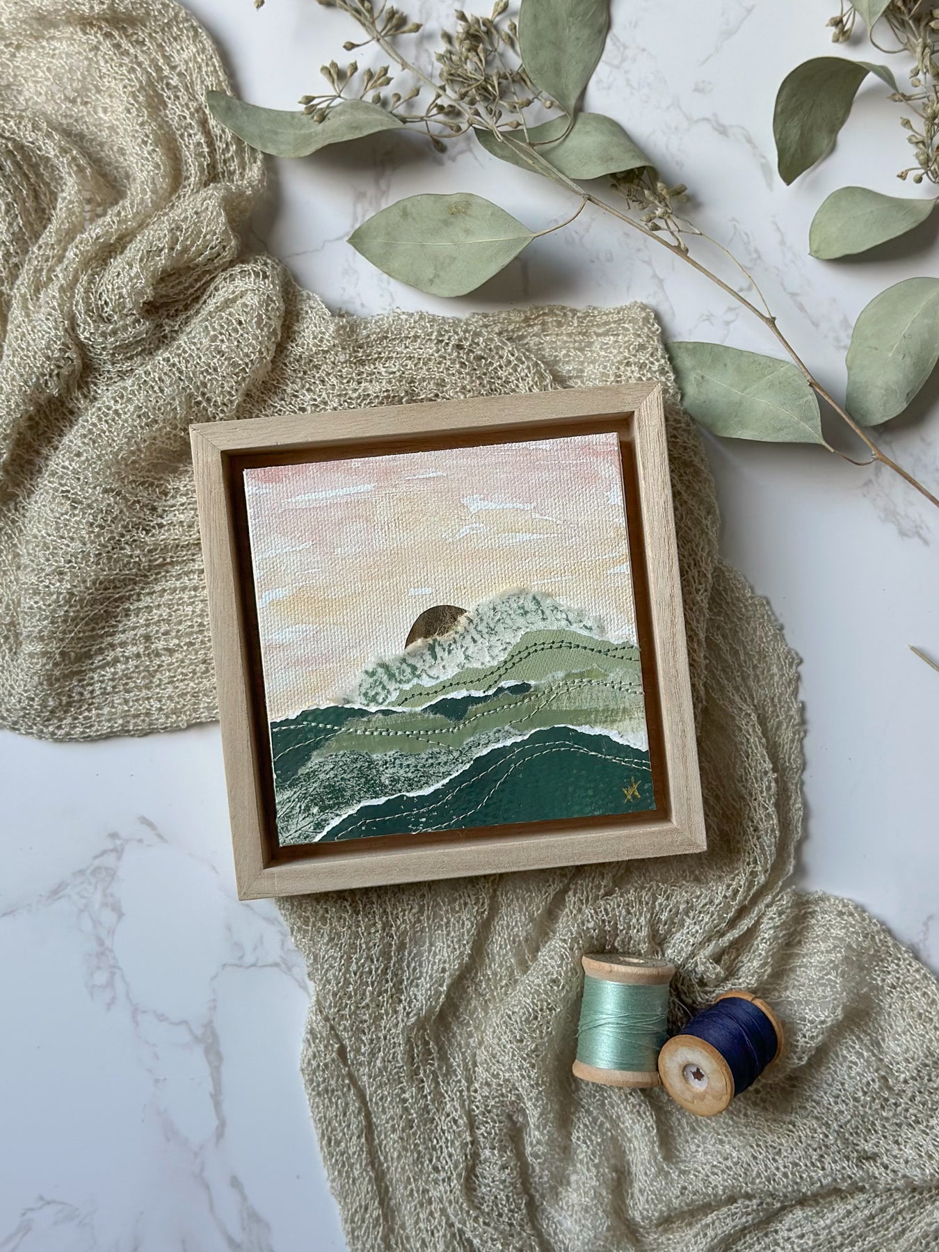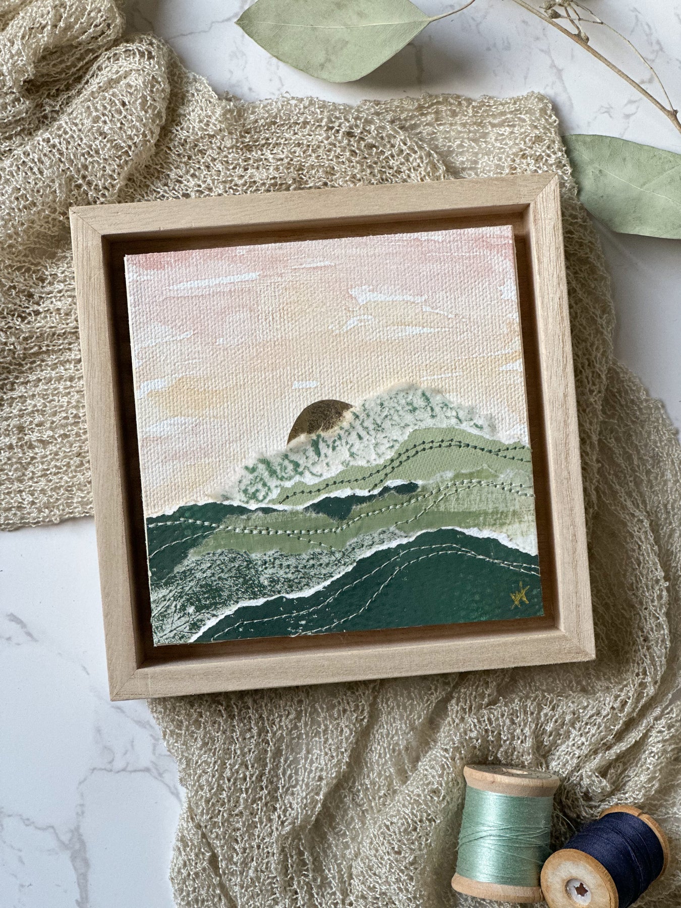 Square 4" x 4” original sewn abstract art on unstretched canvas. Using acrylic and watercolor paints, layered painted papers and a variety of threads. Float mounted in a wooden frame. Frame measures 5" x 5" and is 1" deep. It can be displayed sitting up on a shelf or hung on a wall.