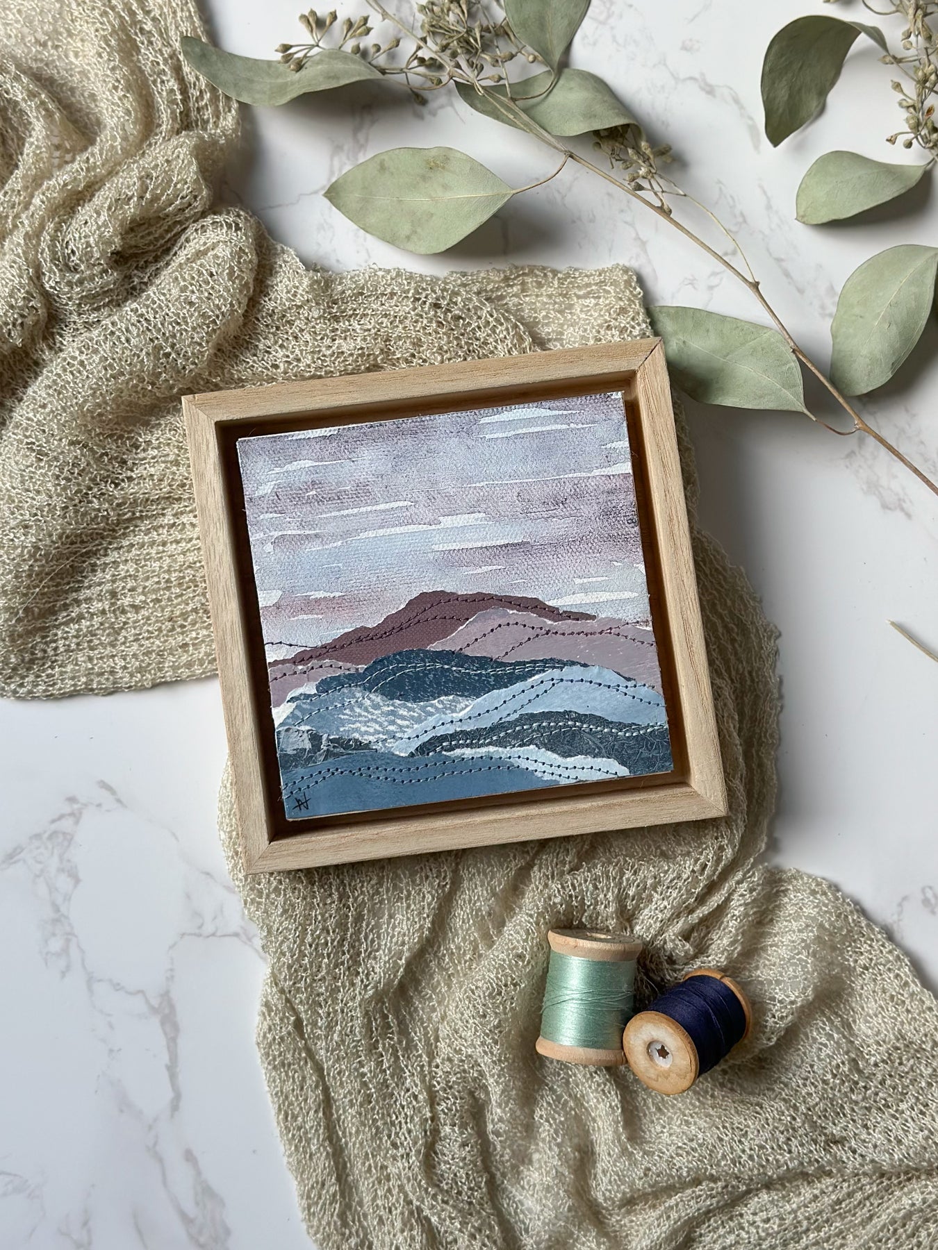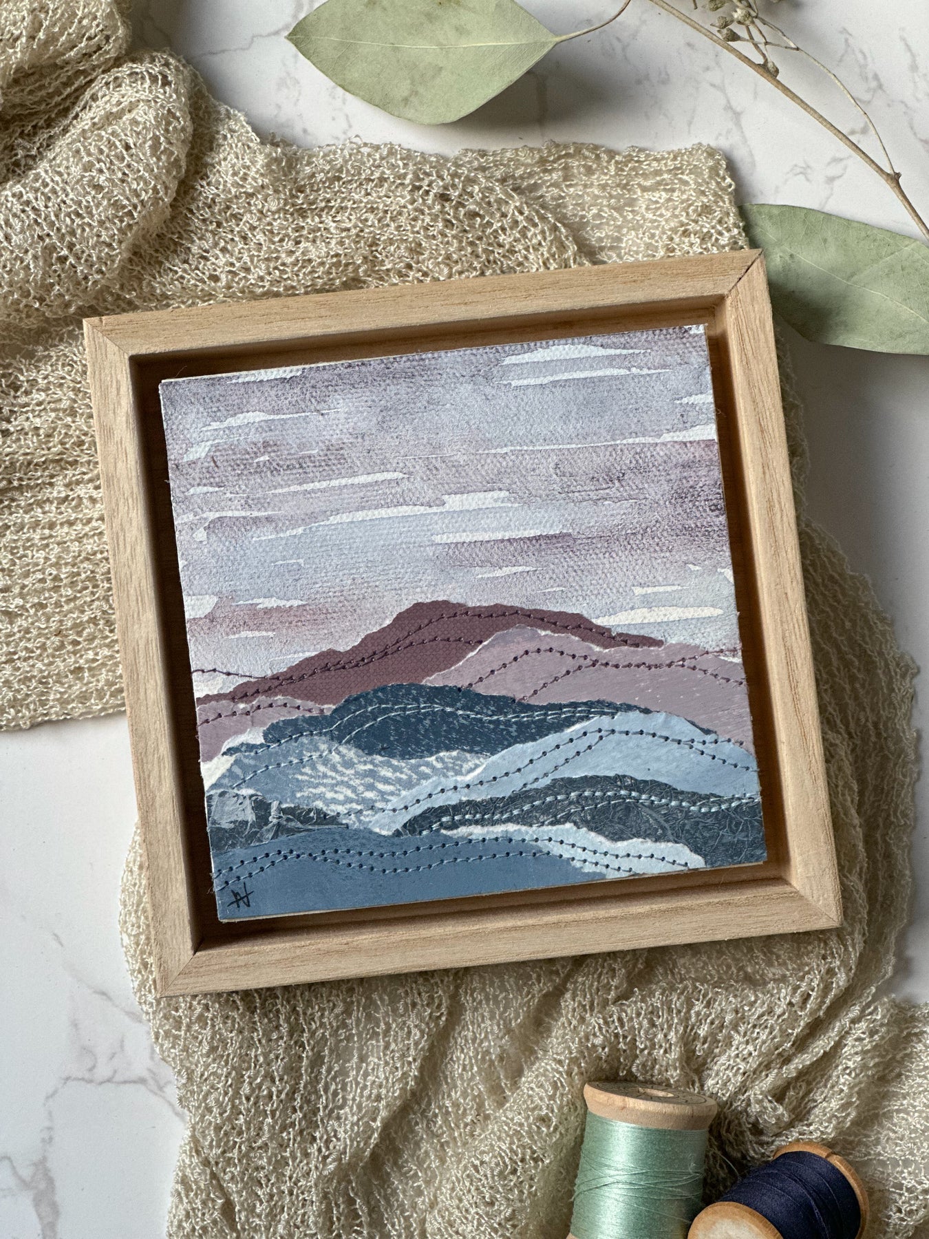 Square 4" x 4” original sewn abstract art on unstretched canvas. Using acrylic and watercolor paints, layered painted papers and a variety of threads. Float mounted in a wooden frame. Frame measures 5" x 5" and is 1" deep. It can be displayed sitting up on a shelf or hung on a wall.