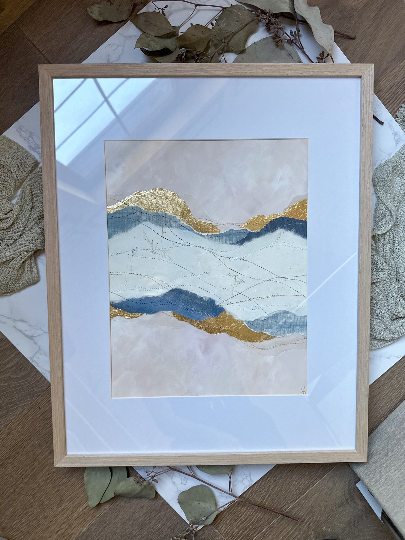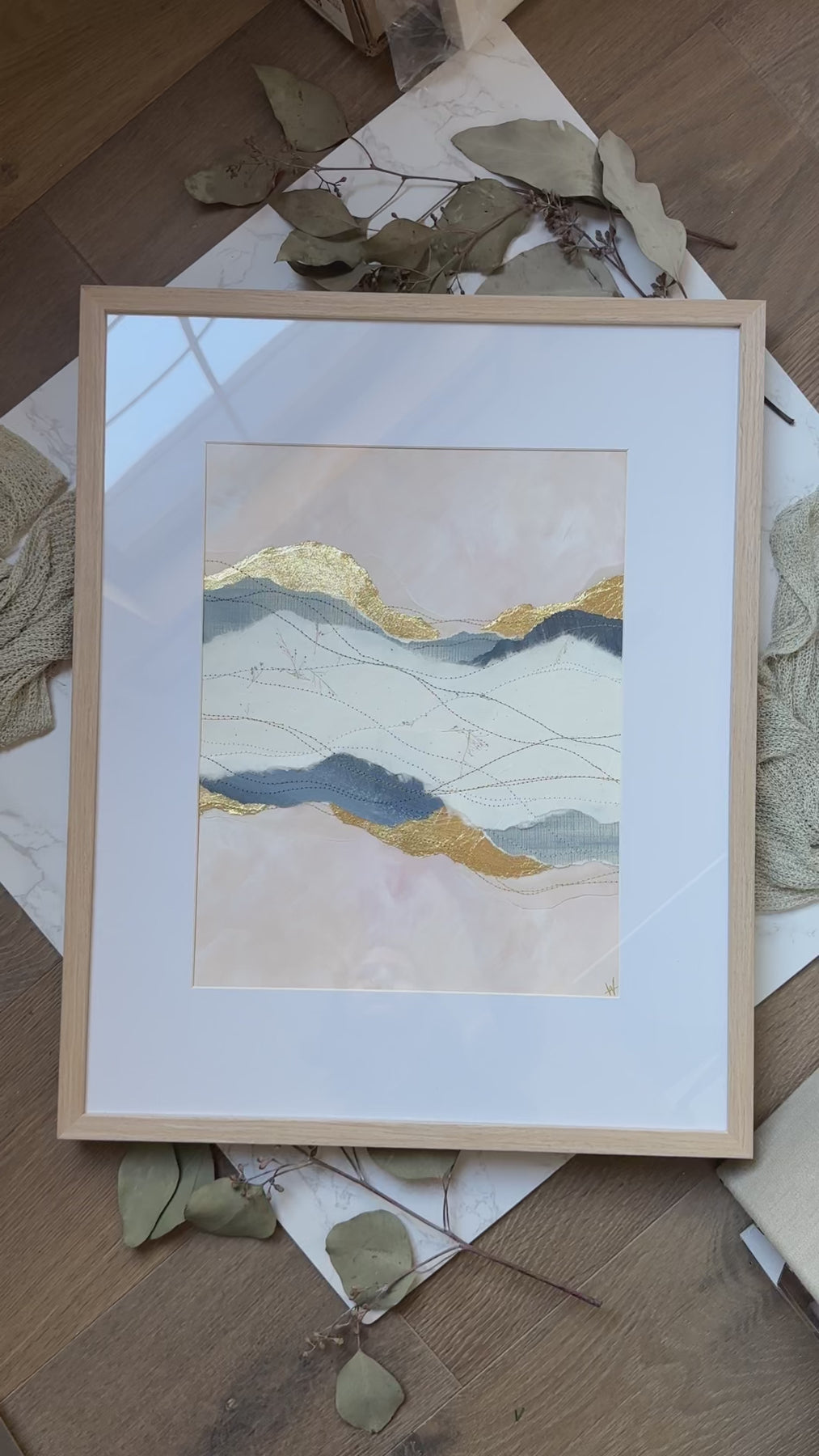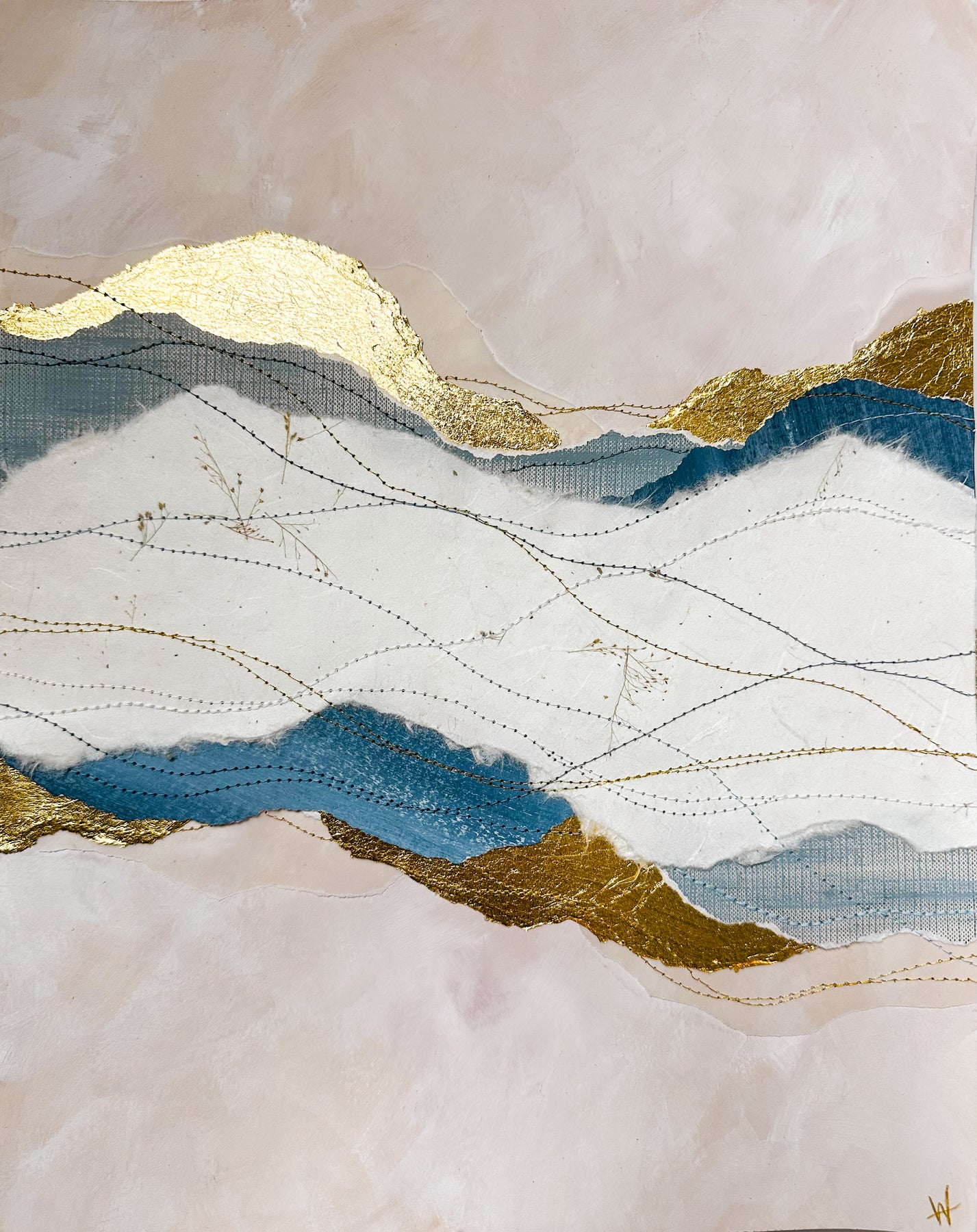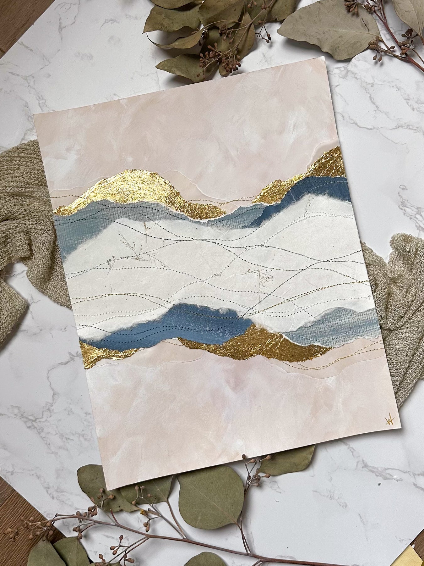 This 11x14 original sewn abstract artwork is created on mixed media paper, using a variety of threads, acrylic paints and gold foil leaf.