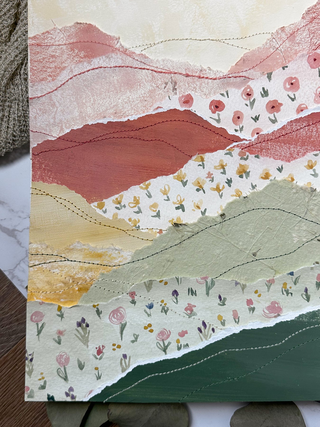 16" x 20" original sewn abstract art on mixed media paper. Acrylic painted papers, layered with watercolor flowers and a variety of threads. Matted and framed in a 21" x 25" wooden oak frame.