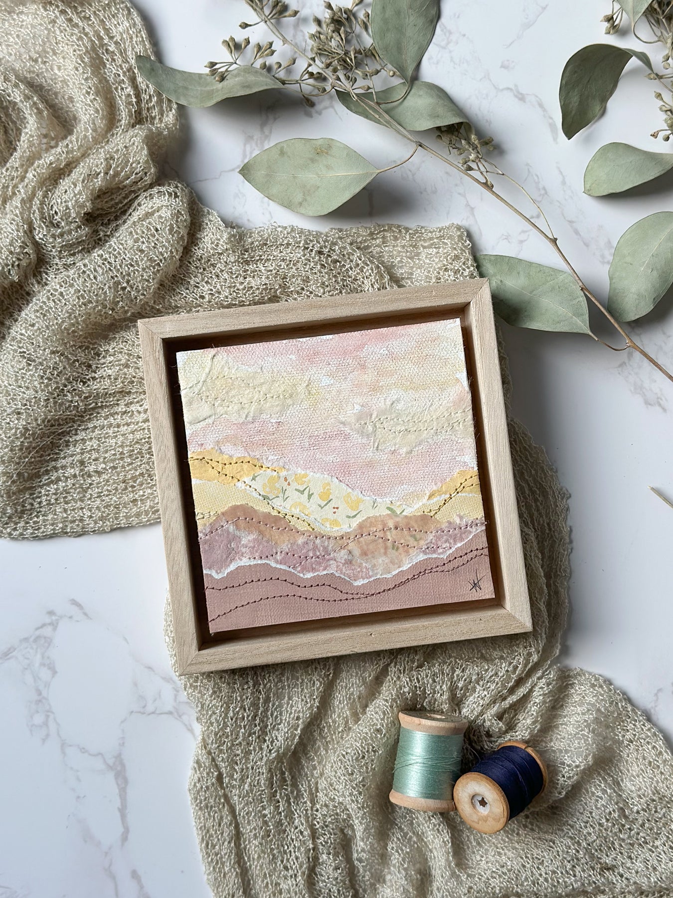 Square 4" x 4” original sewn abstract art on unstretched canvas. Using acrylic and watercolor paints, layered painted papers and a variety of threads. Float mounted in a wooden frame. Frame measures 5" x 5" and is 1" deep. It can be displayed sitting up on a shelf or hung on a wall.