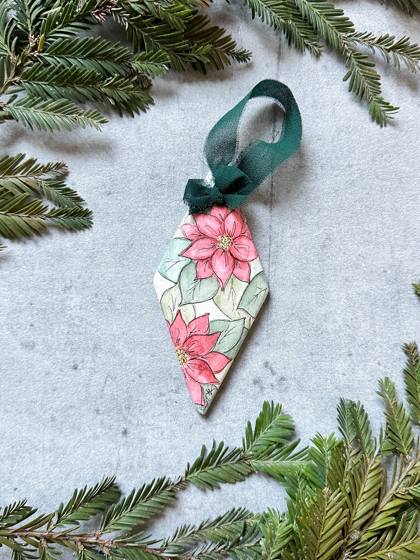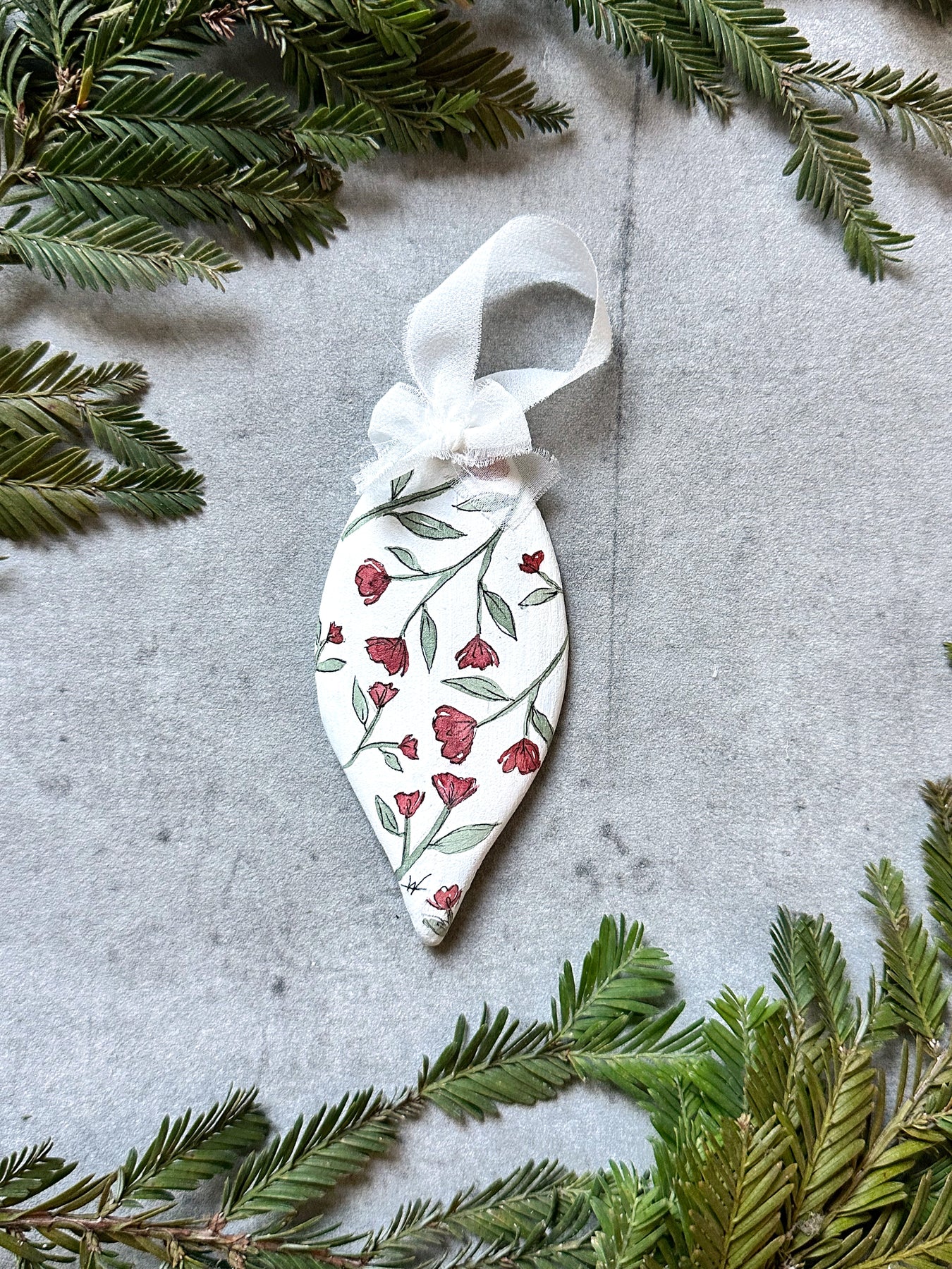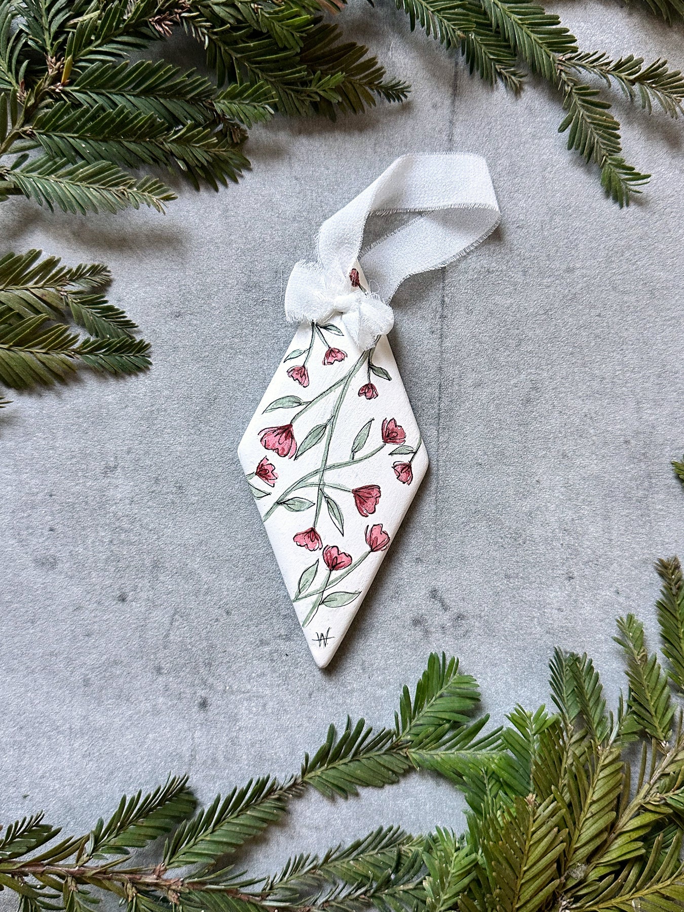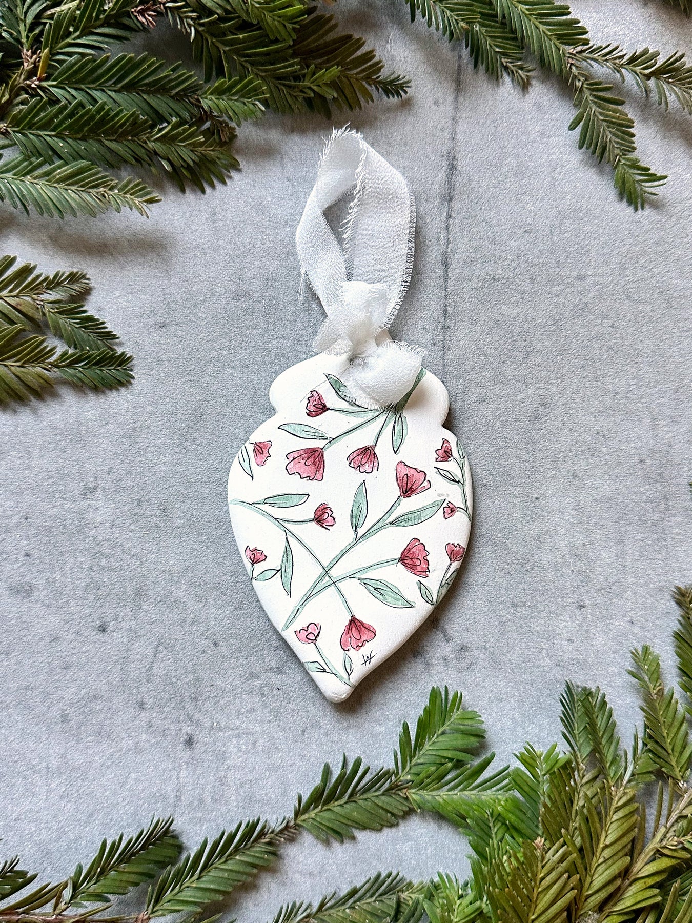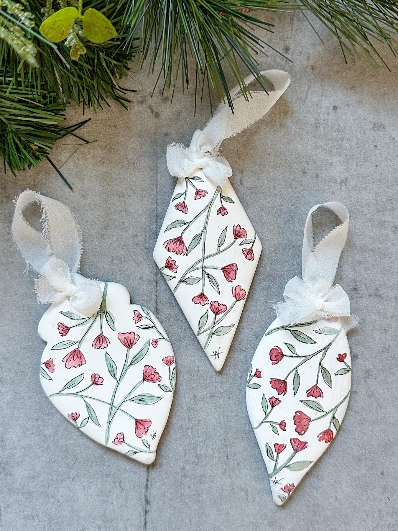 Plaster ornaments with original watercolor florals. Tied with a chiffon ribbon and signed and dated by the artist on the back.