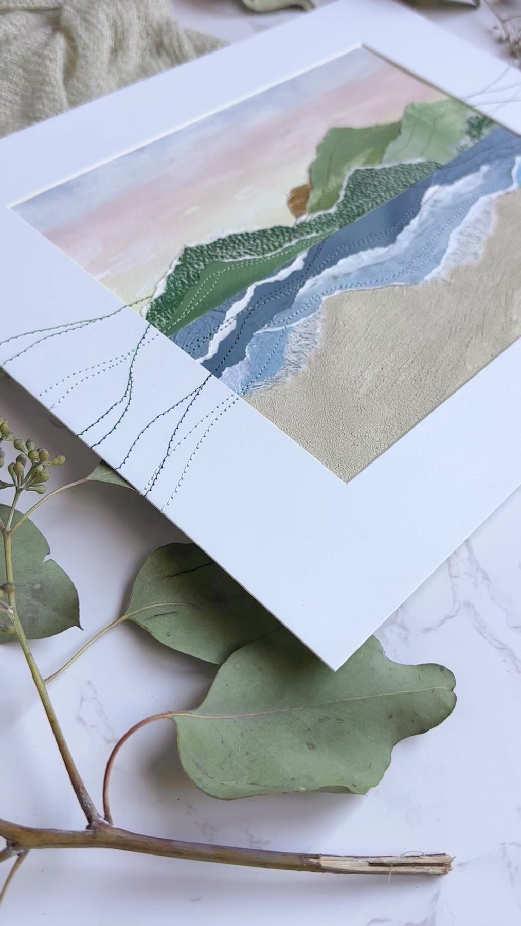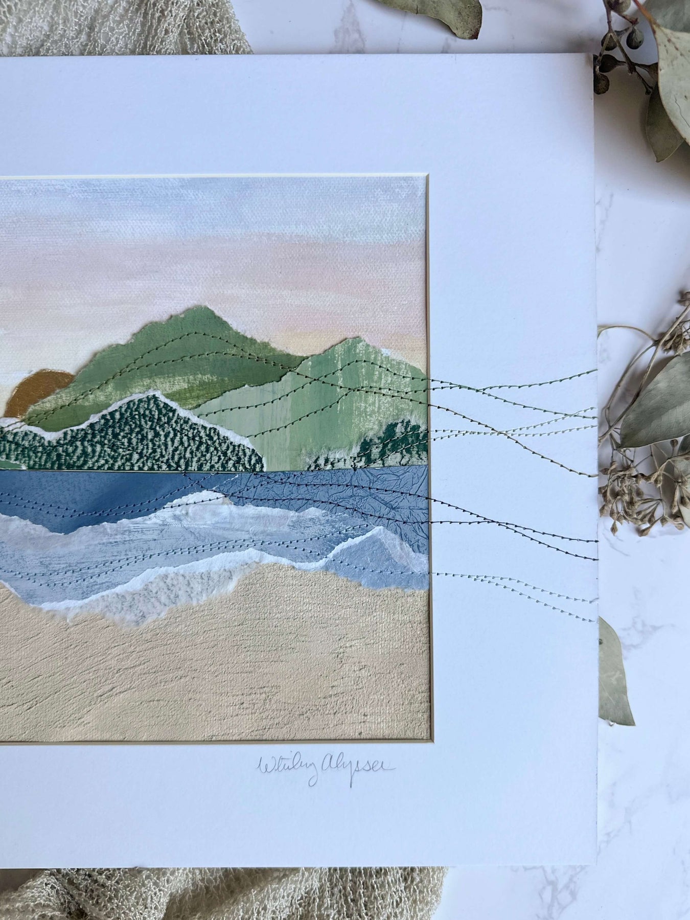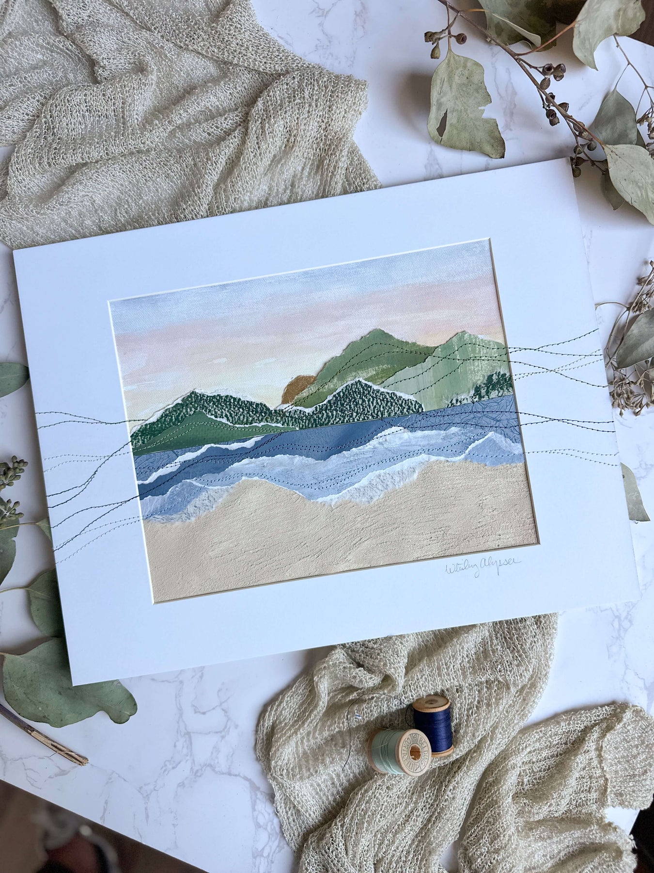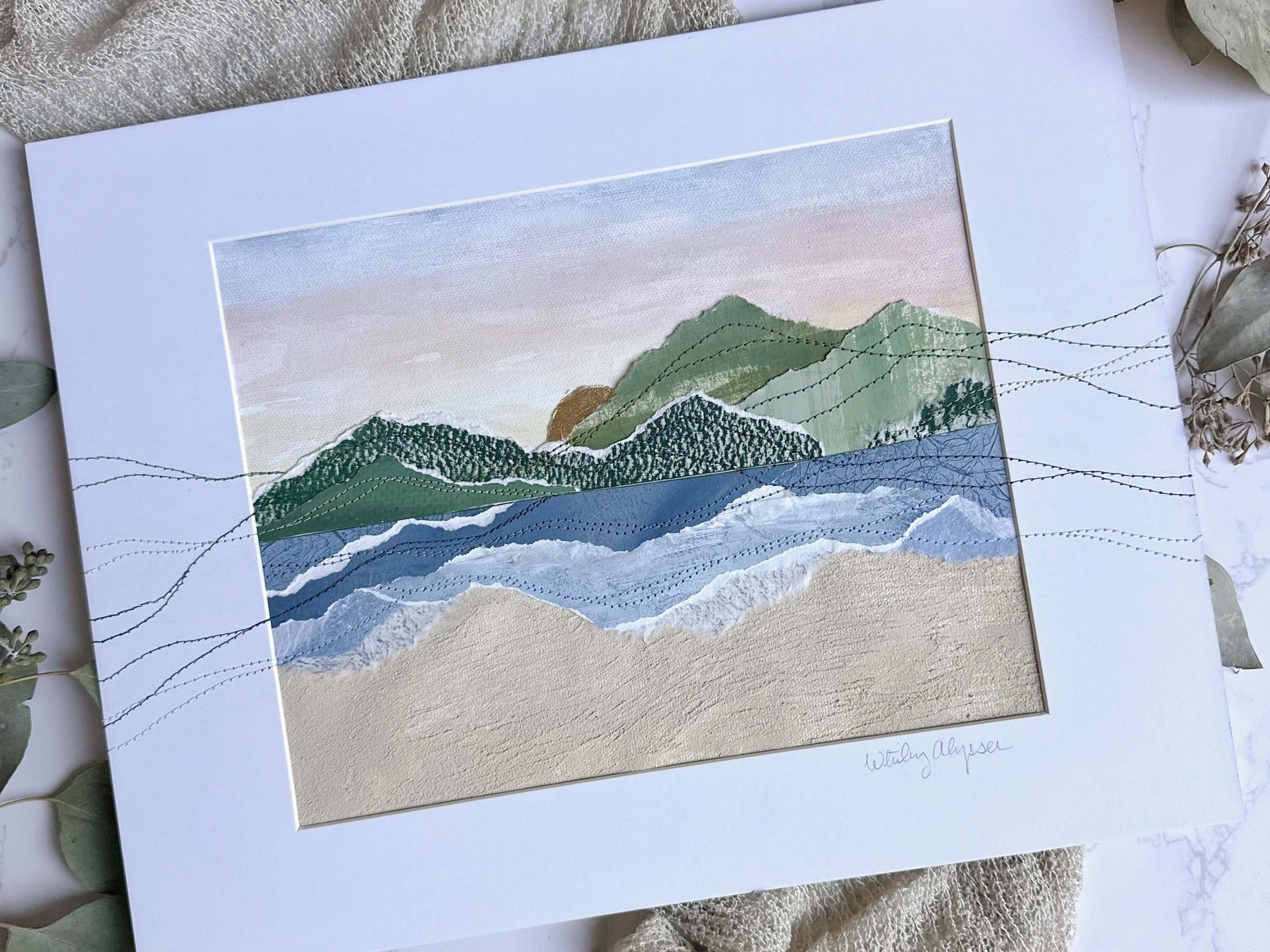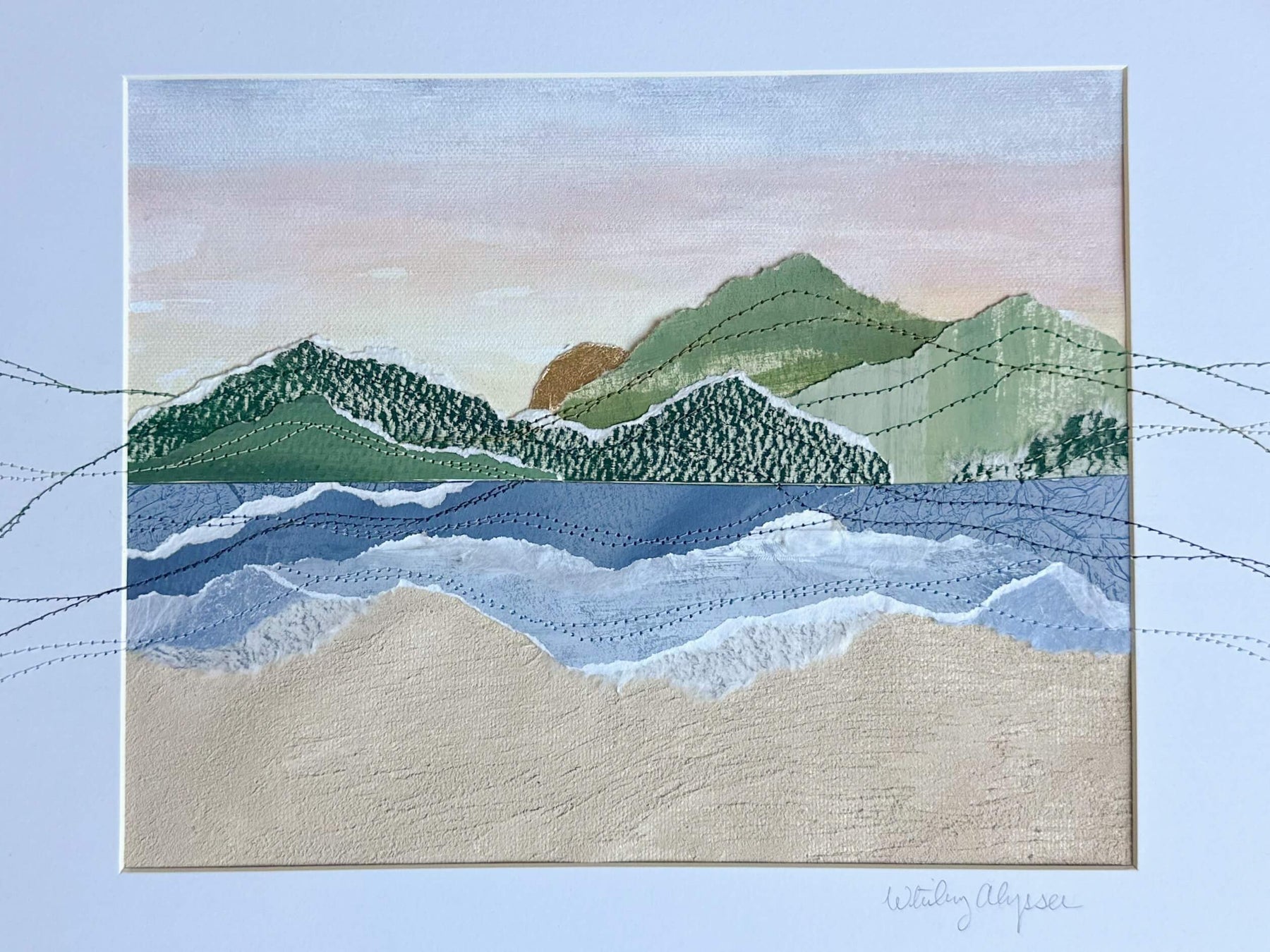 Horizon captures the quiet poetry of where land, sea, and sky converge. Inspired by the meeting point of distant mountains and shoreline, the composition is divided into a serene upper and lower landscape. The top half reveals faraway peaks beneath a softly glowing sunset sky, while the lower portion interprets the sea meeting the sand through abstract washes of color and texture. Hand stitching travels beyond the painted surface and onto the mat, extending the scene outward and reinforcing the sense of continuity that defines the collection. This piece offers a tranquil, contemplative view that invites the eye to linger at nature’s threshold.